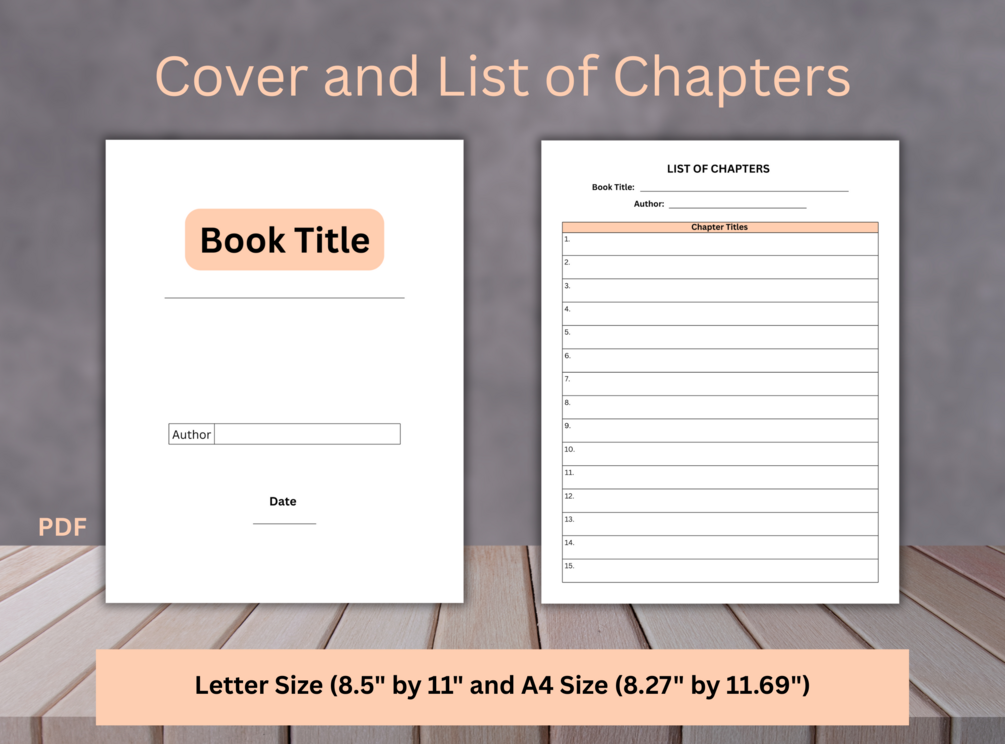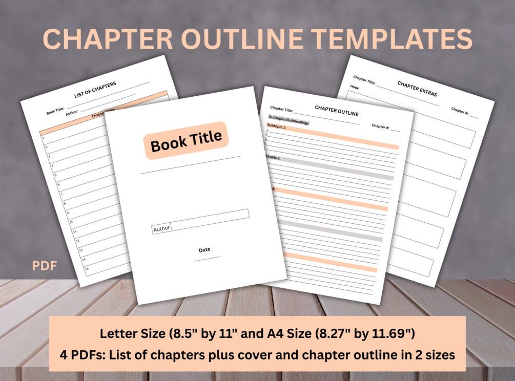 There are 2 templates: List of Chapters with cover and Chapter Outline (includes subtopics, hook, introduction, stories/examples, conclusion, and call to action). The templates come in 2 sizes: Letter size (8.5×11) and A4 (8.27×11.69). They are in PDF format.