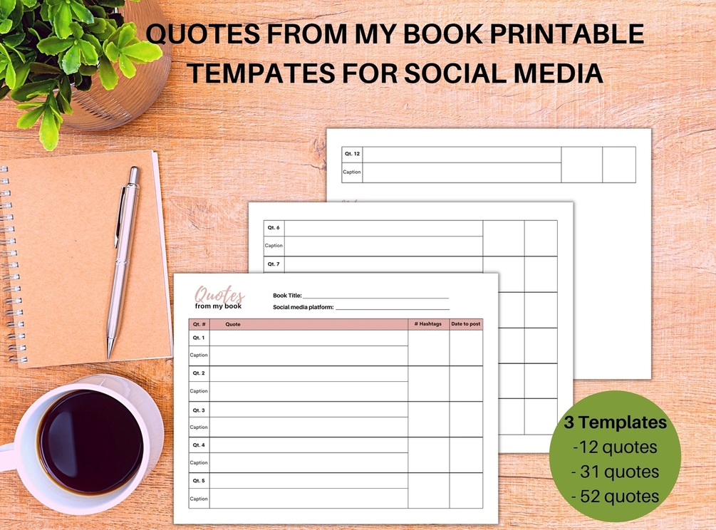 You can post the social media graphics with your quotes as regularly as you want. You will find 3 templates for 12, 31, and 52 quotes. You can recycle and use them for all your books.